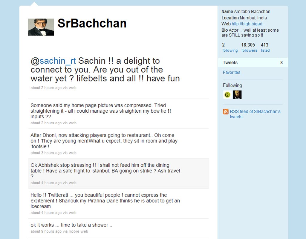 Now its turn of Mr. Amitabh Bachchan joining the world's most popular microblogging service. At 18/05/2010 his followers are 18,305 wow in cyberspace the news spread so fast but why doesn't my blog :P