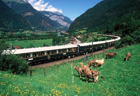 Which train takes you from glaciers to palm trees in just four hours? The gorgeous Bernina Express, which marks its 100th anniversary in 2010. This train takes you across the highest crossing of the Alps (the 7,391-foot Bernina summit), from Chur, Switzerland, to Tirano, just across the border in Italy. Between those two climatic extremes, the train speeds its passengers through delicate meadows, forests and valleys, traversing 195 bridges and 55 tunnels. The train tackles grades of up to 7 percent, and negotiates the steep alpine terrain via numerous switchbacks, loops and viaducts.