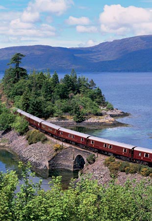 If you’d like to travel the Scottish Highlands in high style, the Royal Scotsman is your conveyance. This luxury train whisks a maximum of 36 passengers through the countryside, past castles, glens, peaks, moors, forests and lochs. The Royal Scotsman follows a number of routes throughout the Highlands, from Edinburgh north as far as Tain, on trips of two to seven days. At the back of the train is an observation car, which has an open-air section on the end where you can feel the Scottish air rush past.