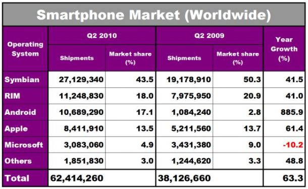 Here's the thing: Smartphones are currently exploding in an unprecedented way, thanks largely to Google's (GOOG) Android OS. Earlier this quarter, Android devices were selling at half the speed they are currently. That doesn't mean other platforms are slowing down either. With the exception of Windows Mobile, every other major platform is growing phenomenally: