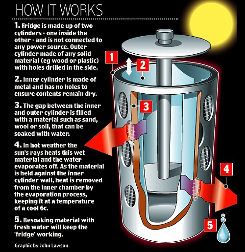 A metal cylinder is placed inside a larger cylinder made of wood or cardboard. The space in-between the two is filled with a material that can be soaked in water, like soil or cloth, and as the sun heats that material and the water evaporates, it pulls the heat off the inner cylinder. Perishables can be kept at a cool 6 degrees C with no power needed whatsoever.
