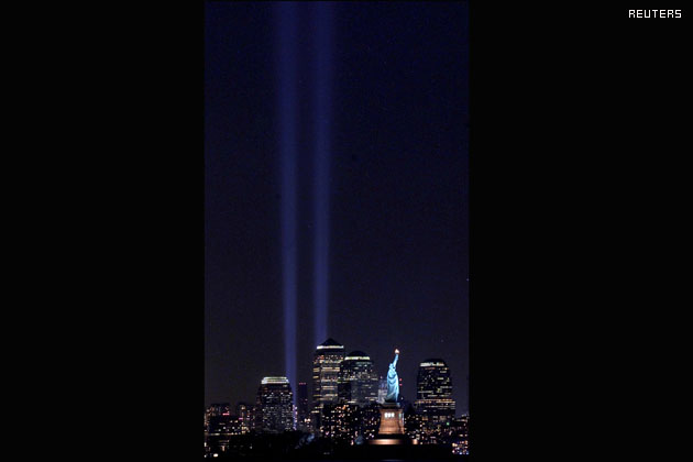 Lights pierces into the sky over New York City's Manhattan Island as a memorial to the victims of the attacks on the World Trade Center March 11, 2002 in this view made across the Hudson River from Jersey City, New Jersey.
