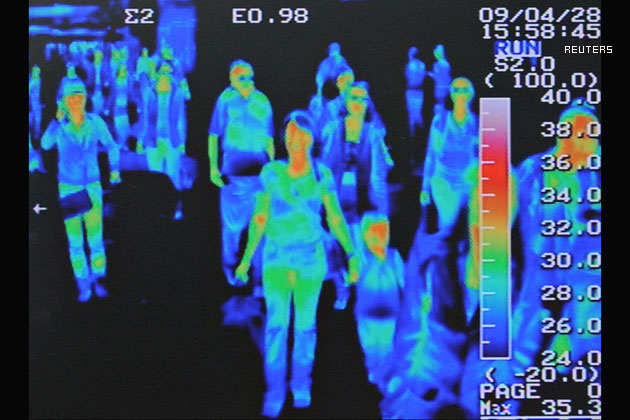 A thermal scanner shows the heat signature of passengers from an international flight arriving at Incheon airport, west of Seoul April 28, 2009.