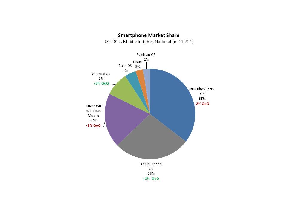 Between Q4 ’09 and Q1 ’10, Android and iPhone’s share of the smartphone market grew by 2% each. At the same time, smartphone leader Blackberry lost 2% share to fall to 35% of all smartphones while Microsoft’s Windows Mobile OS also lost 2% to fall to 19%.