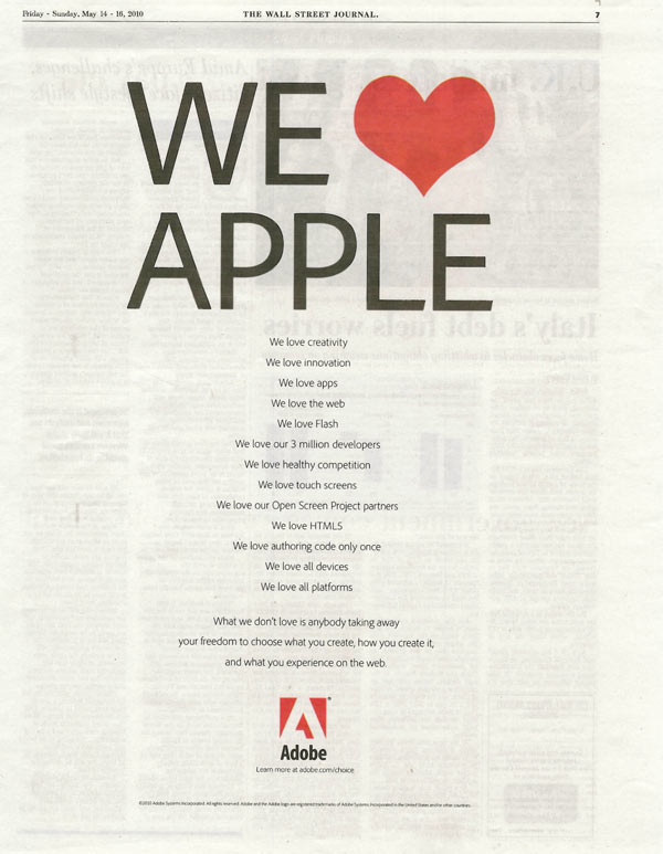 The Financial Times and the Wall Street Journal were both carrying full-page "We Love Apple" adverts on Friday morning, but the space was not bought by the Californian technology giant but by Adobe, the web technology firm that is locked in a bitter dispute with Steve Jobs.