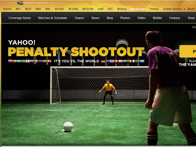 Yahoo’s Penalty Shootout online game launched in May. The game tasks users to try their hand at winning a penalty shootout against friends or strangers. You can choose your country and challenge one of your Yahoo or Facebook friends to a shootout duel. For each shootout, you’ll play the part of both the striker and the goalie, selecting a portion of the goal to either attack or defend.